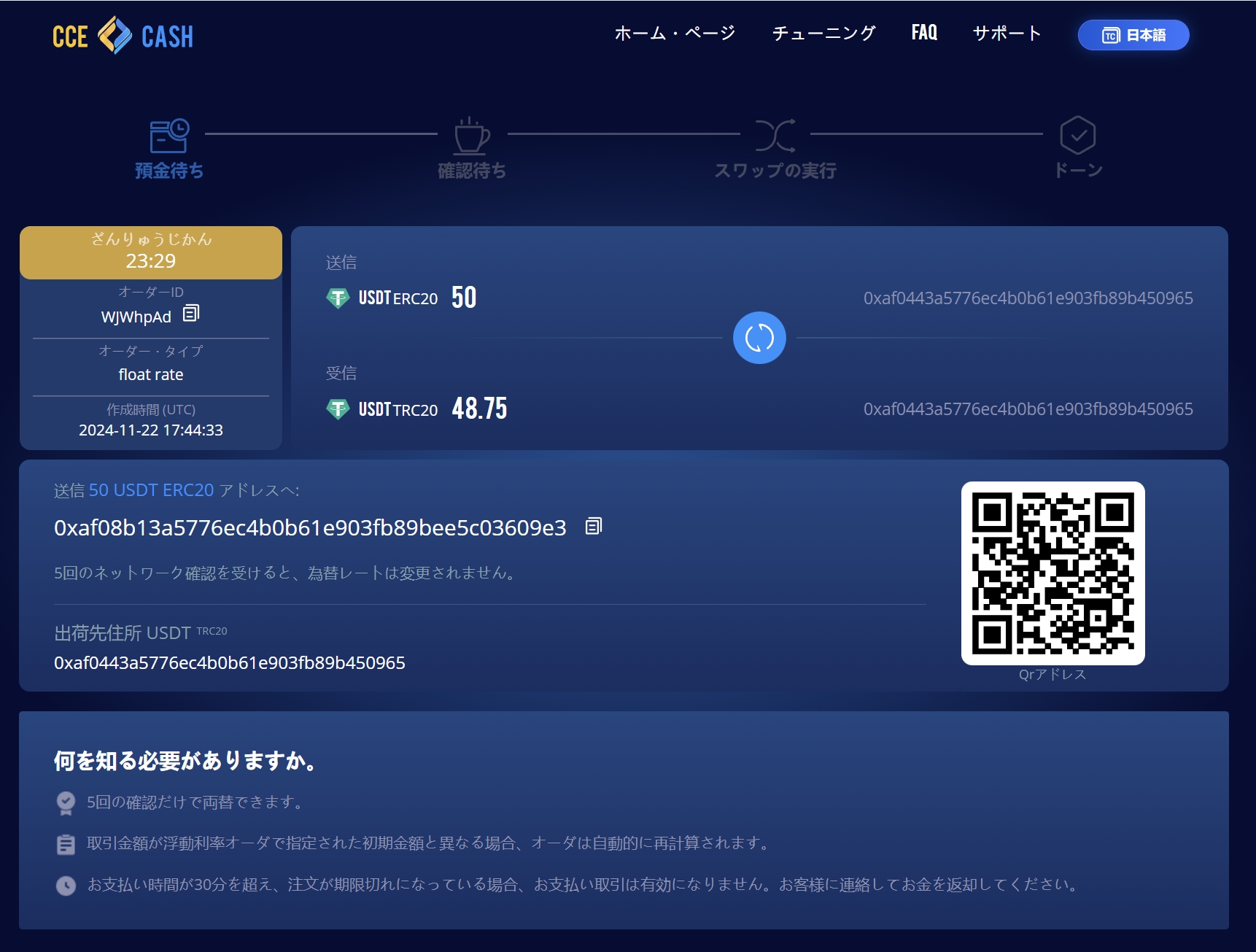- ステップ2,図のように: CCE Cash 交換されたETHを30分以内に転送するETHアドレスを自動的に提供します。ブロックチェーンを5回確認すると、交換したETHが転送されます。BTCは送信したBTCアドレスに転送されます。このプロセスは3~30分以内に完了します。(紛失しないように注文番号を記録してください)