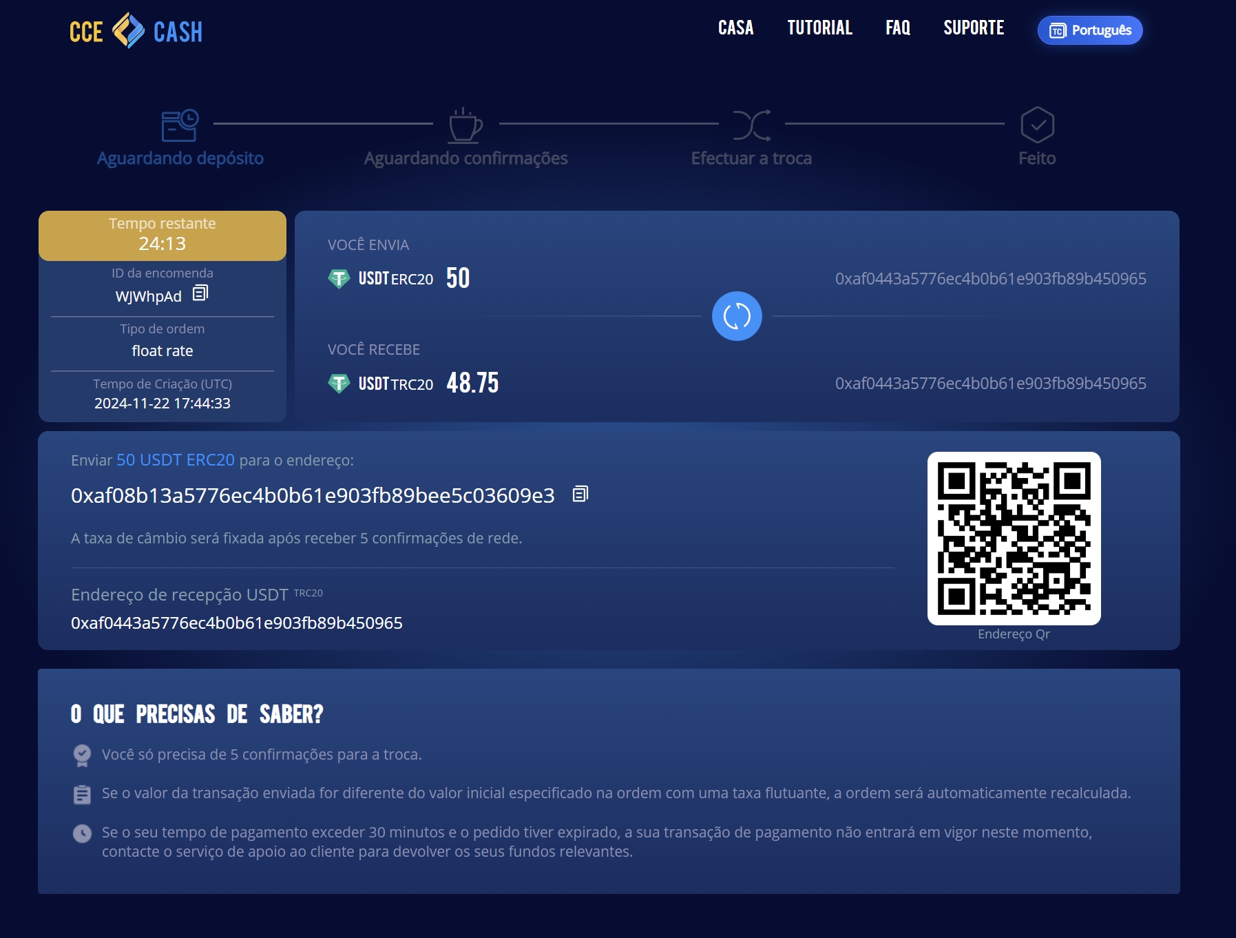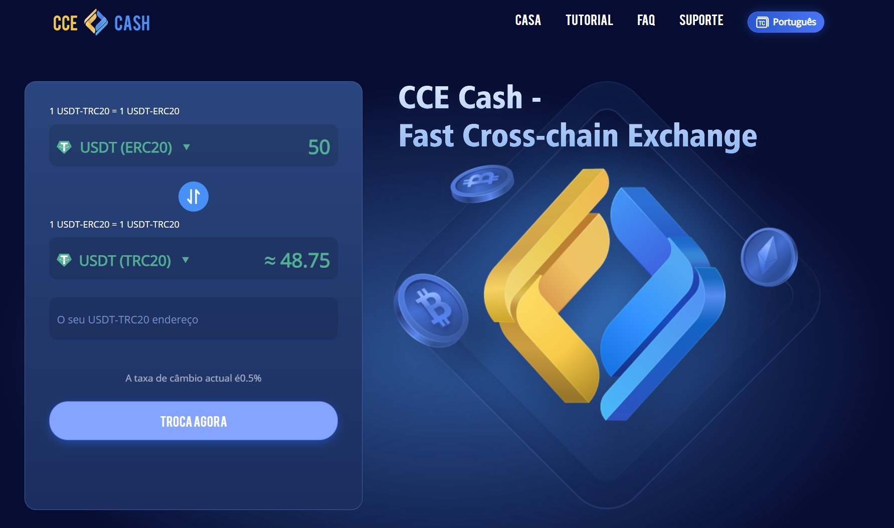 CCE Cash é um serviço não custodial criado para trocas de mistura simples e rápidas. Nós nos esforçamos para máxima segurança, simplicidade e conveniência. Nós não armazenamos seus fundos ou exigimos a criação de qualquer tipo de conta. Não há limites; você pode resgatar o quanto quiser - sem registro, sem problemas e mais rápido do que a luz.