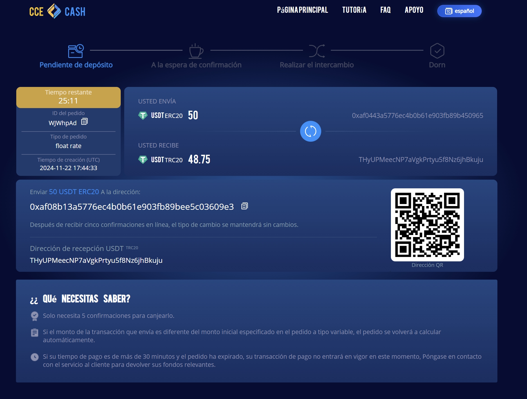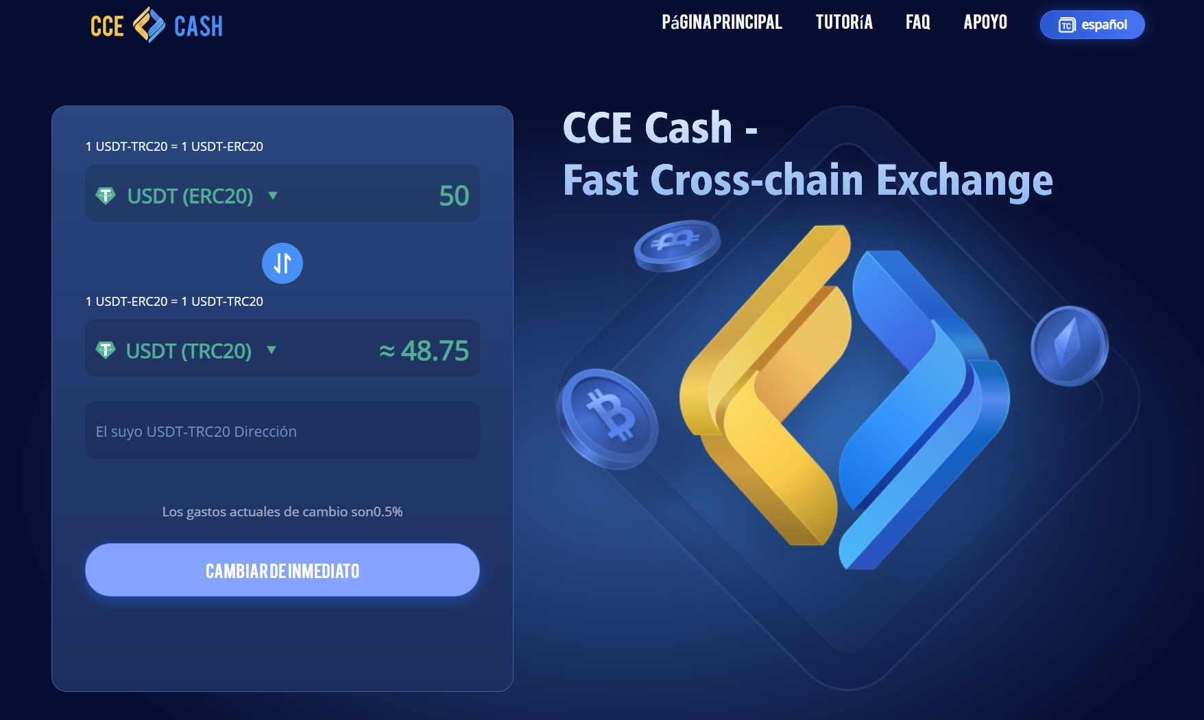 CCE Cash Es un servicio no gestionado creado para un intercambio híbrido simple y rápido. Buscamos la máxima seguridad, simplicidad y conveniencia. No almacenamos sus fondos ni le pedimos que cree ningún tipo de cuenta. No hay restricciones; Puede cambiar cualquier cantidad de efectivo, sin registro, sin problemas y más rápido que la velocidad de la luz.